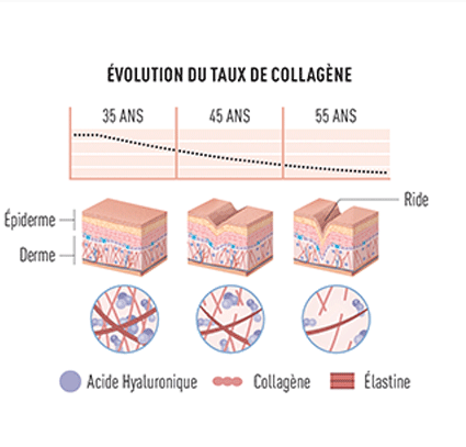 Voici de manière schématisée l’évolution du taux de collagène produit naturellement par l’organisme :