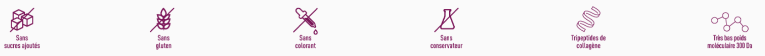 Ingrédients : Hydrolysat de collagène (poisson), arôme naturel framboise, hyaluronate de sodium, L-glutathion réduit, L-hydroxyproline, extrait d’acérola (Malpighia glabra L.) standardisé en vitamine C, extrait d’hibiscus (Hibiscus sabdariffa L.), huile d’onagre (amidon modifié, antioxydant : tocophérol), L-glycine, L-proline, élastine (poisson), extrait d’immortelle (Helichrysum italicum), jus concentré de grenade (Punica granatum), colorant : poudre de betterave, bromélaïne, trans-resvératrol (Polygonum cuspidatum), extrait de vigne rouge (Vitis vinifera L.), sel de sodium de NADH (β-Nicotinamide adénine dinucléotide réduit), vitamine E (amidon modifié), vitamine B3, coenzyme Q10, édulcorant : sucralose, vitamine A (amidon, sirop de glucose, épaississant : gomme d’acacia, antioxydant : alpha-tocophérol), céramides, vitamine B8.
