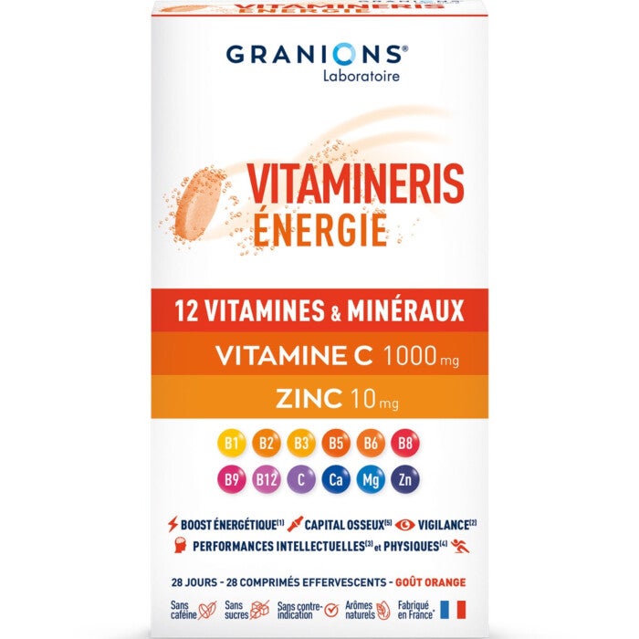 Pour stimuler les fonctions essentielles de votre corps et préserver votre capital santé, le Laboratoire des Granions® a développé VITAMINERIS Énergie 1000mg, un concentré de 9 vitamines et 3 minéraux. Cette association unique permet de soutenir votre forme physique et mentale au quotidien. Elle contient notamment 1000 mg de Vitamine C et du Magnésium, qui participent au métabolisme énergétique et aident à réduire la fatigue.